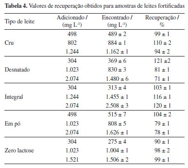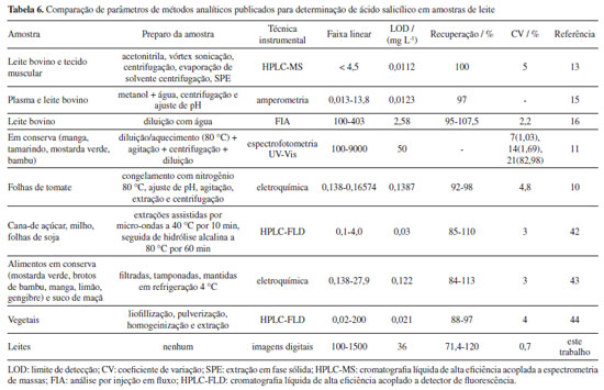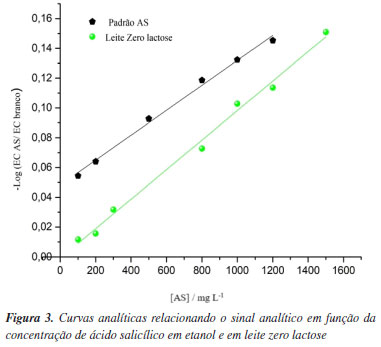 Aplicação em amostras de leite As amostras leite desnatado, em pó, cru, zero lactose e integral foram submetidas ao procedimento proposto e ao procedimento espectrofotométrico convencional, descrito na literatura.45 Não foi detectada a presença de ácido salicílico dentro da faixa linear obtida neste trabalho. É importante mencionar que a presença de ácido salicílico não é permitida em qualquer concentração e em nenhum tipo de amostra de leite.