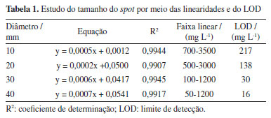 Avaliação do tamanho do spot test O tamanho das zonas circulares em que a reação colorimétrica se realizará influencia diretamente no sinal analítico. Tamanhos maiores permitem a adição de um maior número de mols do analito, favorecendo assim a detecção de concentrações menores. Por outro lado, é comum a formação de gradientes de cores quando as reações colorimétricas são realizadas em papéis circulares, com uma maior concentração de cor na borda do papel. Esse fato pode reduzir a repetibilidade e a detectabilidade do método. Para esta avaliação foram utilizados papéis preparados com zona circulares com tamanhos de 10, 20, 30 e 40 mm e curvas analíticas foram construídas utilizando, inicialmente, os parâmetros de intensidade de cor do modelo RGB. Como pode ser observado na Figura 1S (Material Suplementar), as relações lineares obtidas utilizando os canais RGB como sinais analíticos não foram satisfatórias. Isso pode ser explicado pelo fato de que a coloração roxa do complexo formado é uma combinação dos componentes vermelho (R), verde (G) e azul (B) do modelo de cores. Quando relacionados com a concentração, nenhum apresenta relação diretamente linear. Nesse caso, os valores de RGB obtidos podem ser transformados em um único parâmetro, denominado escala de cinza (EC).36 Portanto, os valores de escala de cinza de cada reação realizada na faixa de 50 a 3500 mg L-1 de ácido salicílico foram calculados e os resultados apresentados na Tabela 1. Verificou-se o aumento do sinal analítico em diâmetro de até 40 mm. A faixa linear e o limite de detecção foram menores utilizando tamanho de 40 mm, pois quanto maior o tamanho do spot maior será o número de mols adicionados ao papel para formação do complexo. Entretanto, o tempo de secagem e homogeneidade da cor formada apresentaram melhores resultados com tamanho de 30 mm, sendo que a faixa linear e LOD estão próximos aos obtidos com 40 mm. Dessa forma, o tamanho de spot de 30 mm foi estabelecido como ideal e utilizado para otimização dos outros parâmetros.