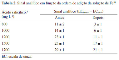 Influência da ordem da adição dos reagentes em solução padrão A ordem de adição dos reagentes é um parâmetro importante no desenvolvimento de uma reação colorimétrica. Visando maximizar a intensidade do sinal analítico, avaliou-se a intensidade de cor gerada pela reação em função da ordem dos reagentes, com concentrações de ácido salicílico variando entre 800 e 1700 mg L-1. O sinal analítico líquido considerado foi a subtração do valor das escalas de cinza adquirida antes (ECbranco) e depois (ECsinal) da adição dos reagentes. Os resultados estão apresentados na Tabela 2. Como pode ser observado, o sinal analítico foi maior quando a solução de FeIII foi adicionada primeiro (indicado como "antes" na Tabela 2. A coluna "depois" trata-se dos resultados obtidos com a adição de FeIII após a adição de ácido salicílico). Este fato pode estar relacionado a interação dos grupos hidroxila do papel com as moléculas de ácido salicílico, resultando em uma menor disponibilidade do AS para reagir com os íons FeIII.37 Portanto, o procedimento estabelecido foi adicionar à solução de FeIII inicialmente ao dispositivo de papel.