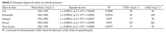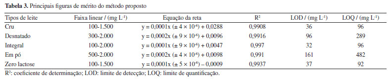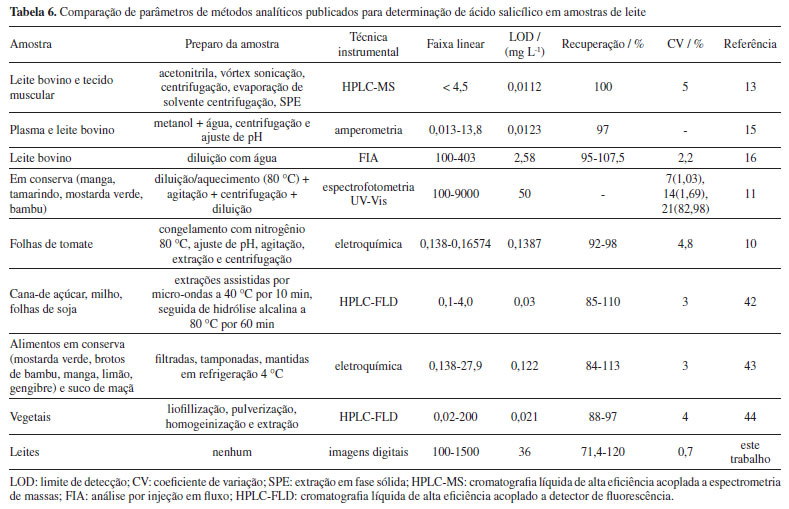 O desempenho analítico do método desenvolvido foi comparado com outros métodos disponíveis na literatura,10,11,13,15,16,42-44 conforme apresentado na Tabela 6. Dos oito trabalhos descritos na Tabela 6, três realizaram estudos em amostras de leite utilizando instrumento de alto custo, como o HPLC-MS (cromatografia líquida de alta eficiência acoplada a espectrometria de massas), ou de preparo laborioso de amostras, com exceção do método que utiliza injeção em fluxo, que emprega apenas uma diluição. A faixa linear obtida neste trabalho está próxima aos métodos que utilizaram reações colorimétricas e espectrofotometria. As grandes vantagens do método proposto são a simplicidade operacional, miniaturização, nenhum preparo de amostra, baixo consumo de reagentes e custo reduzido quando comparadas às técnicas instrumentais utilizadas nos trabalhos descritos.