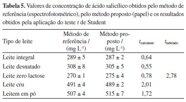 A capacidade de um método analítico em fornecer resultados próximos a um valor real ou aceito é avaliada por meio da figura de mérito de exatidão. Neste trabalho, os resultados obtidos pelo método proposto foram comparados com os obtidos pelo método de referência13,16 utilizando o teste t de Student. Os valores de concentração de ácido salicílico em diferentes amostras de leite obtidos pelos dois métodos estão apresentados na Tabela 5. Considerando que o valor t tabelado é 2,78 (a = 0,05), é possível concluir que os resultados obtidos são estatisticamente idênticos no nível de confiança de 95%.40,41