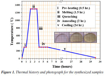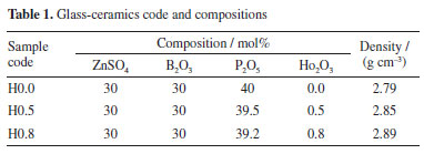 EXPERIMENTAL Synthesis of glass-ceramic samples The raw materials of high purity (99.999%) analytical grade reagents, ZnSO4, B2O3, H3PO4, and pure Ho2O3 (99.999%) were used in the fabrication of new glass ceramics (GC) with a well-defined stoichiometric compositions of (40-x)P2O5-30B2O3-30ZnSO4-xHo2O3 (with x = 0.0, 0.5, and 0.8 mol%) coded as H0.0, H0.5 and H0.8. These GC with constituent's batch of 20 g each were made via melting-solidified approach The resultant mixture of the compositions was gradually preheated at low temperature (300 ºC) for 30 min before being transferred to another furnace for complete melting at 1300 ºC for 90 min. Succeeding, the molten was poured on a warmed stainless-steel plate and solidified at 300 ºC for 2 h. To conclude, the obtained samples were kept in furnace and logically cool down to room temperature. Finally, samples were stored in a moisture free environment at room temperature. Some portions of the as-quenched samples were crushed into fine powder for structural and thermal analyses. Table 1 shows the sample compositions alongside the sample's codes. Additionally, the thermal history and photograph for the synthesized samples (with ~2 cm diameter) is presented in Figure 1.