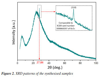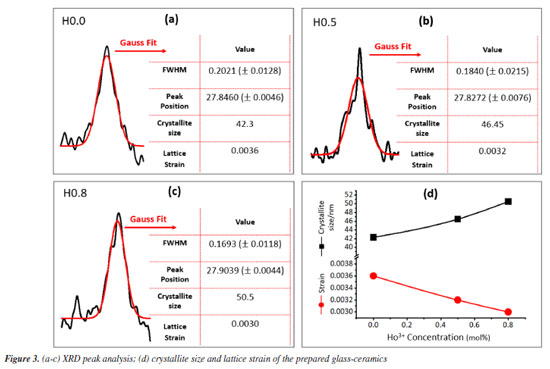 RESULTS AND DISCUSSION Structural properties The XRD (X-ray diffraction) pattern of the as-produced H0.8 sample is epitomized in Figure 2. The obvious wide diffraction halo around 20-40º indorse the amorphous nature of the present samples. In addition, a little diffraction peak noted at 27.84º was due to the reflection from the (310) lattice plane of B2O3 (based on ICDD card number 000060297), confirming the formation of the glass-ceramic phase. This peak was further analyzed and well fitted by using Gaussian function for all samples. The consequential fits are presented in Figures 3a, 3b and 3c, respectively. Evident from the said Figures together with Figure 3d affirmed that the crystallite size amplified from 40.30 to 50.00 nm and congruently strain decreased from 0.036 to 0.030 with increasing content of Ho3+ ions. The augmentation in the FWHM (full width at half maximum) and crystallinity stature of our GC originated from the quantum size effect. This remark is indeed consistent with the similar findings reported in Alqarni et al.4 and Gao et al.22 The enhanced crystallite size revealed an enhancement in the arrangement of atoms in the GC matrix with the replacement of phosphorus by holmium. This also indicated the formation of more bridging oxygens in the GC network