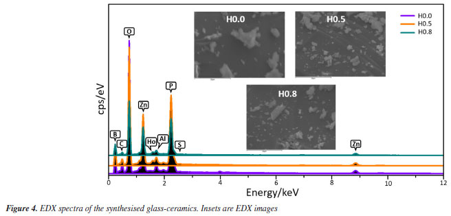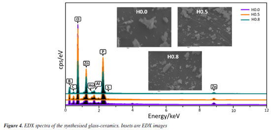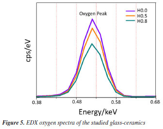 To validate the structural and elemental analysis of our produced glass-ceramics, the typical EDX plot of all samples is shown in Figure 4. An inset unveiled the corresponding EDX images. The EDX scrutiny attests that the elemental constituents harmonized with the initial stoichiometry during the fabrication process. Figure 5 shows the EDX oxygen spectra for H0.0, H0.5 and H0.8 samples. The intensity of the oxygen spectra decreased with the increase of Ho3+ which implied lack of non-bridging oxygen participation due to the formation of more bridging oxygen. This finding is in good agreement with the enhanced crystallite size revealed by XRD.
