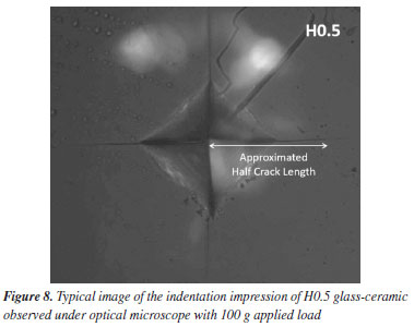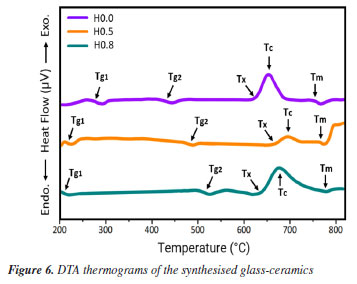 Characterisation of the synthesized glass-ceramics By employing X-ray diffractometer (SmartLab Rigaku) equipped with Cu-Kα (wavelength ≈1.5406 Å) radiation, the microstructure status of our fabricated GC was exposed. This was conducted by logging the data in the angular range (2θ) from 10º to 80º with a step size of 0.02º. Additionally, the integrated EDX (energy-dispersive X-ray spectroscopy) in field-emission scanning electron microscope (FE-SEM) was used for microstructure analysis. In addition, the thermal stability potency of GC was verified by differential thermogravimetry analysis (DTA). This was piloted by using thermal analyzer (HITACHI STA7200 model) at a heating rate of 10º min-1 within nitrogen atmosphere. Last but not the least, the microhardness measurement was carried out by using digital microhardness tester of Shimadzu HVM-2 model at room temperature. Particularly, 100 g load was applied for a peak-load time of 10 s, and the diagonals of indentation were measured with an accuracy of ± 0.1l m. Afterwards, the Vickers microhardness values was deduced as an average of 10 readings collected from different position of the sample surface.
