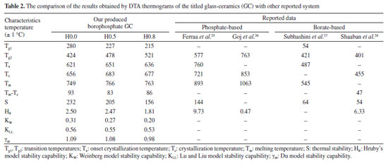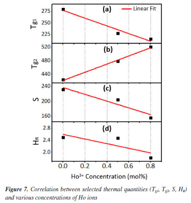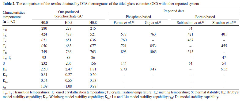 The stability capability of the present glass-ceramics was further computed by employing the following thermal models:29 ![]() An inclusive result attained herein were compiled in Table 2 and presented in Figure 7, and also validated through a suitable comparison with those obtained for other phosphate and borate-based glasses. The occurrence of two Tg's in this study implied that the samples have two structural phases.30 Assertively, Tg2 value was in the range of the Tg for many phosphate glass systems,31-33 while Tg1 corresponds to the other phase present in the sample. It was found that the value of Tg2 increased with the increase of Ho3+ in good agreement with other analysis in the manuscript. However, the Tg1 values were relatively very low and reduced with the increase of Ho3+. This revelation is common in many plastics, polymers (network structure like ceramic-glass) which are partially crystalline: they, therefore, have a glass transition temperature below which the amorphous phase freezes (somewhat lower due to partial crystallinity). Indeed, it is also an indication of enhancing the crystallinity of the crystalline areas inside the glass-ceramic network. The behavior of Tg1, and also hardness Hv result from a structural changes of the glass-ceramic network with probably the presence of small crystallites B2O3.34