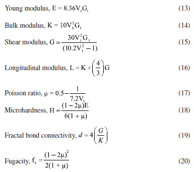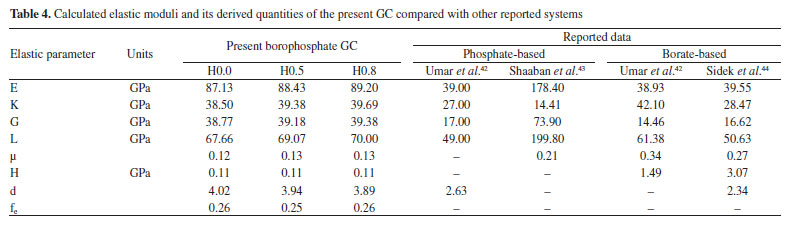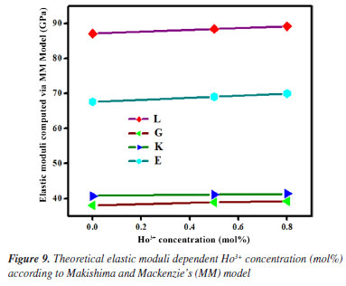 Theoretical evaluation of elastic moduli by using Makishima and Mackenzie's model By invoking the ionic the values of packing density (PD) and dissociation energy Gt, the elastic moduli namely, Young (E), bulk (K), shear (G) and longitudinal (L) modulus as well as its derived parameters such as micro-hardness (H), Poisson ratio (μ), fractal bond connectivity (d) and Fugacity (fe) of the current GC were theoretically computed by adopting Makishima and Mackenzie's (MM) model as follows:41 ![]() where RA and R0 are the ionic radius of metal and oxygen, respectively. ![]() By using the above-described formulations, the elastic moduli and its consequential entities were evaluated and enlisted in Table 4. Figure 9 typified the correlation between elastic moduli and Ho3+ contents in the present GC. Furthermore, a comparison between our findings with existing data on other borate and phosphate-based glass system has been established. Observably, the elastic moduli including E, G, K and L slightly increase with the increase in the H2O3 content. The noted upsurge in these parameters is attributed to the growth in the median bonds per unit volume together with cross-link density.45 Similarly, increment in Ho3+ content may augment the Coulomb factor of the lattice energy in the glass-ceramic system. However, large discrepancy between L and G moduli was observed which may be accredited to the volume effects. Rationally, resistance to penetration or indentation of any depends on it micro-hardness.46 The unchanged behavior observed in micro-hardness values signified a constant rigidity and network connectivity in the present glass ceramic.