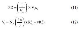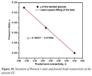 Basically, the variation of the Poisson's ratio (μ) in glass-ceramics reveal the dimensionality changes in its network. It has been established that the glass-ceramic network structure with 0.1 to 0.2 value of μ implied high cross-link density in the network whereas those within 0.3 to 0.5 range of μ specified low cross-link density in their network. Evidently, our attained value of μ ranging from 0.12 to 0.13 affirmed high cross-link density in the studied glasses.47 Besides, the evaluation of the effective dimension of certain materials for any disorderly mixture of fluid and solid backbone near the percolation limit as proposed by Bergman and Kantor48 by using fractal bond connectivity (d) analysis classified network dimension as follows: for a 2-dimensional network, d value falls around 2.0 meanwhile the 1-dimensional glass network structure is symbolized by d value around 1.0 and for a 3-dimensional network, the d value is around 3.0 to 4.0. In the studied glasses, d-value for all glasses found to be ~4.0 which certifies their 3D network. However, careful assessment of μ and d trend (see Table 4) testified that the network dimensionality (d) of the present borophosphate based glass-ceramic network is decreasing while the Poisson's ratio is almost constant with increasing concentration of Ho3+. This disclosure coincides with the proposed semi-empirical formulae μ = A - zd,49 which is well fitted to the curve epitomized in Figure 10 and yielded μ = 0.40857 - 0.0708d. The achieved values for the two constants A and z further validate the earlier claim with σ = 0.45 - 0.083D in oxyfluoro-zinc-tellurite.50 Another vital quantity herein examined is the fugacity defined as the fluctuation of free volume of a system.51 This unit play a very crucial role molecular dynamics of liquids. It detects the degree of rigidity of the glass network. A mathematical model by great scientist called Williams-Landel-Ferry (WLF) was proposed to describe the viscosity of inorganic glasses and their structural properties.52 Therefore, careful examination of Table 4 revealed that the values of fugacity remain almost constant. This indeed reinforced the outcome from micro-hardness and the Poisson ratio.