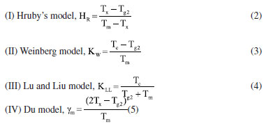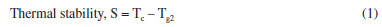 Thermal scrutiny of as-synthesized GC Typically, DTA or DSC results exposed both melting and recrystallization peaks of materials.23 Therefore, the thermal entities of present glass-ceramics were acquired by DTA thermograms and the attained results are presented in Figure 6. Evidently, the Figure 6 revealed relatively dip curve above 600 ºC terming crystallization temperature (Tc). The onset crystallization temperature is denoted by Tx and transition temperature is marked as Tg (Tg1 and Tg2). The melting temperatures (Tm) of the glass-ceramics was also ascertained from the DTA plot. Instantaneously, these parameters (Tg1, Tg2, Tx, Tm) together with thermal stability (S) evaluated by using the given the following expressions previously employed elsewhere24 and the attained data are tabulated in Table 2. Standard deviation was ± 1 ºC for all data. ![]()