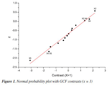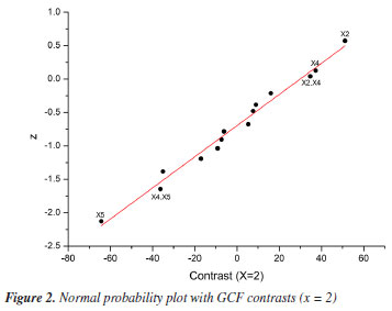 Based on the results, normal probability plots for the GCF responses (x = 1 and x = 2) were generated, reflecting the interactions between variables and calculated contrasts (Figures 1 and 2). It was thus possible to identify that the variables X2, X4, and X5, as well as the interactions between them, proved to be more significant in separating the majority chromatographic peaks, in addition to the number of peaks per time. Besides that, the strong synergistic interaction between X2 and X5 leads to a better distribution of peaks in the chromatogram (Figure 2S, Supplementary Material), which is essential for adjusting the analysis time at the end of the process. The significant variables were more favorable at their +1, +1, and -1 levels, respectively, which correspond to X2 = 100%, X4 = 1% and X5 = 0.5 mL min-1 (experiment 15, Table 3). These variables are essential for greater efficiency in the analysis, so they were chosen for a more detailed statistical analysis, with a greater number of levels, using Doehlert design.