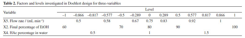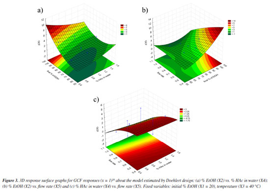 For the less significant variables, values were assigned according to the level at which they showed the greatest responses, also considering the resolution of the main chromatographic peaks and the elution time of the last peak. The initial EtOH percentage variable (X1) was set at 20% because it showed the second highest response (experiment 12, Table 3), the best resolution of the main chromatographic peaks (Figure 1S, Supplementary Material), and the shortest elution time of the final peak. The temperature variable (X3) was assigned a value of 40 ºC, as it is the midpoint of the levels that showed the best responses, in experiments 12 and 15 (Table 3; Figures 1S and 2S). This temperature requires less energy than 50 ºC (the temperature of the experiment with the best response) but maintains satisfactory resolutions of the main chromatographic peaks. Doehlert design Based on the information obtained in the fractional factorial design, the significant variables were submitted to the 3-variable Doehlert design to calculate the values that provide the best condition for separating the compounds from the orange waste using HPLC (Table 4). As the GCF (x = 1) response function was equivalent to the GCF (x = 2) in the screening of variables, it was decided to use only the GCF (x = 1) as the response in this new design, the best results of which are shown in Figures 3S-5S (Supplementary Material).