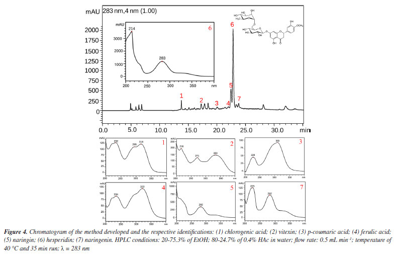 About the lack of fit, the test indicates that it is not significant, which shows that the method developed is efficient and does not need to be optimized again.11 Therefore, the method can be concluded based on the best experimental responses and will be efficient for its intended use. Identification of the compounds of interest To identify the compounds of interest, the UV spectra and retention time of the chromatographic peaks of the orange waste chromatogram were compared with those of authentic standards, and then co-injection experiments were performed for confirmation. As a result, it was possible to identify the 2 main markers of C. sinensis and a further 4 phenolic compounds, totaling 7 compounds in the chromatographic profile of the residue: caffeic acid, vitexin, p-coumaric acid, ferulic acid, naringin, hesperidin and naringenin (Figure 4, Figures 6S-12S, Supplementary Material).
