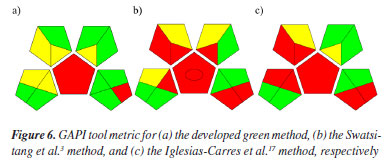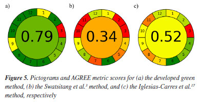 It can therefore be seen that the developed green method is efficient and greener than those found in the literature,3,17 being as good as or even better than existing methods. Something important to note is factor 3, which was considered not green in both experiments and relates to the form of analysis, which in both cases was off-line, meaning that both were carried out by manual processes, a parameter considered not very green for AGREE.18 Another noteworthy point is parameter 7, which concerns the amount of solvent used. Although we try to get around it, analytical methods such as HPLC require solvents for the analysis to take place. Their quantity can and should be reduced, but the waste generated is, until now, unavoidable. This project therefore aims to reduce the quantities of solvents used as much as possible. Finally, parameters 10 and 11 relate to the use of toxic solvents and operator safety,18 being considered non-green for the conventional methods compared. It can therefore be concluded that the method developed is safe for the environment and the operators of the technique. In addition to the AGREE metric, the GAPI tool metric19 was used for comparison, which once again shows that the method developed is greener than those found in the literature, as shown in Figure 6. The center of the image is red (not ideal) in all methods because both need to go through the extraction process, which the metric considers to be not green.