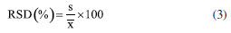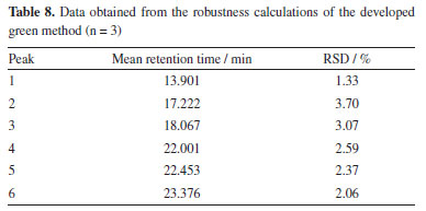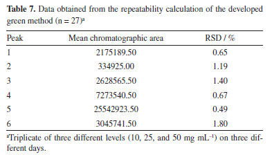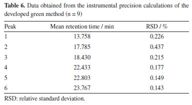 Although the resolution does not exceed 1.5 mark for all peaks, it is important to emphasize that because these compounds are widely known and are of great interest to the pharmaceutical and food industries, the authors of this study considered the identification of these compounds by HPLC-DAD alone to be satisfactory at the concentrations evaluated, reaffirming their proposal to develop an efficient and low-cost method for analyzing the main compounds present in orange waste. However, at concentrations where the plant material / volume of extracting solvent ratio is less than 10 mg mL-1 (lowest concentration evaluated in this work), the identification of peaks 4 and 5 may be impaired. In this case, co-injection experiments or the application of this green method in an HPLC system coupled to a mass spectrometer may be necessary. Method validation The parameters of selectivity, precision, and repeatability were used to reproduce the measurements and, using Equations 2 and 3, the data contained in Table 6 was obtained, where it can be seen that the standard deviations obtained are small values according to ANVISA14 and ICH15 standards (which determines that the RSD must be > 5%),14 thus showing that the deviations between each measurement are minimal, giving greater reliability to the method developed.