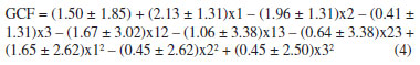 The response surfaces (Figure 3), obtained from the mathematical model estimated by Doehlert design (Equation 4), made it possible to identify the regions where the values of the variables show maximum efficiency. ![]()