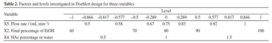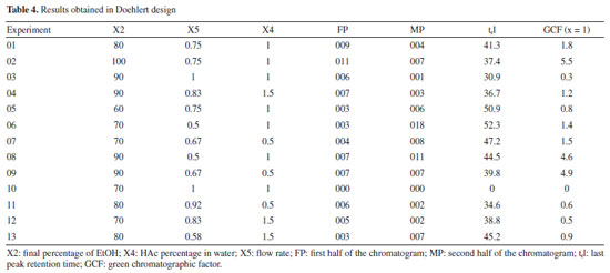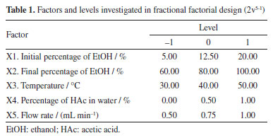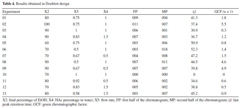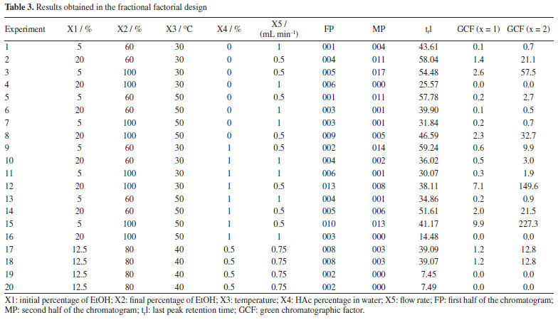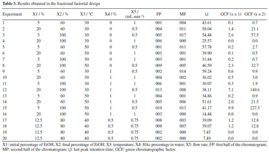 EXPERIMENTAL Materials and methods Reagents The solvents used as the mobile phase for HPLC analysis were food-grade ethanol (bioethanol, EtOH 96%; Kalim, Brazil), and ultra-purified water with HPLC-grade acetic acid (HAc, 99.9%; Merck®, St. Louis, MO, USA) varying in concentration by 0.4, 0.5, 1.0, and 1.5%. The standards used to identify compounds for HPLC analysis were: caffeic acid, vitexin, p-coumaric acid, ferulic acid, naringin, hesperidin, and naringenin (all Sigma-Aldrich®, St. Louis, MO, USA). The orange waste was provided by Fazenda Guacho, in Santa Cruz do Rio Pardo, São Paulo, Brazil. Preparation of the extract The residue was frozen, freeze-dried for 48 h at a temperature of -20 ºC (Alpha 1-2 LDplus, Martin Christ®), and then pulverized in an industrial processor (Bermar®). A quantity of 1 g of the powder was subjected to dynamic maceration with 20 mL of a 7:3 (v/v) EtOH/water extractant solution for 4 h at 25 ºC and 250 rpm, on a magnetic stirrer with probe (MR Hei-Tec, Heidolph®), resulting in a concentration of 50 mg mL-1 (plant material / volume of extracting solvent). The extract was then transferred to a 1.5 mL microtube (Eppendorf®) and centrifuged for 8 min at 1500 rpm. The supernatant was filtered through a 0.45 µm polytetrafluoroethylene (PTFE) microfilter (Allcrom®) and transferred to 1.5 mL vials for subsequent injection into the HPLC-DAD. HPLC-DAD analysis The analyses were performed in an HPLC apparatus (Shimadzu®) equipped with a 4-channel pump (LC-20AT), automatic sampler (SIL-20A), column oven (CTO-10AS), photodiode array detector (SPD-M20A), C-18 reverse phase column (250 × 4.60 mm, 5 µm; Luna Phenomenex®) coupled to a pre-column of the same stationary phase (Phenomenex®). The injection volume was 20 µL, the solvents used were water + HAc (A) and EtOH (B) and the analysis was monitored at λ = 283 nm. Screening of variables (fractional factorial design - 2v5-1) To develop the method, the GCF (green chromatographic fingerprinting) experiment planning method developed by Souza et al.13 was used as a parameter (Equation 1). ![]() where n is the total number of peaks in the chromatogram, FP represents the peaks in the first half of the chromatogram and MP represents the peaks in the second half of the chromatogram. Finally, trl represents the time of the last peak, disregarding dead time. The design was initially carried out with a series of 20 experiments in which 5 factors were varied, with an analysis time of 60 min (Table 1).