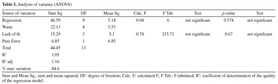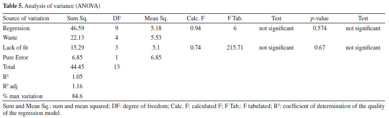 The optimum final percentage of EtOH (X2) would be in the region of 100% (Figure 3a). For the variable percentage of HAc in water (X4), the optimum region comprised the extreme values used in the development of the method, ranging from 0.4 to 1.8% (Figure 3b), depending on the flow rate (X5). Because of this, the value of 0.4% was set as the optimum for variable X4, as a lower concentration of HAc has a lower environmental impact. The optimum region for the flow rate variable (X5) was between 0.5 and 0.4 mL min-1 (Figure 3c). Because of this, experiments were carried out (n = 3) comparing the two flow rates and it was found that the majority of chromatographic peaks showed better resolution when the flow rate was 0.5 mL min-1. As a result, it was possible to conclude that the variation in final percentage of EtOH (X2) directly interfered with the elution force of the mobile phase, working on the distribution of the peaks in the chromatogram. On the other hand, the percentage of HAc in water (X4) was responsible for a possible suppression of the ionization of the acid metabolites in the complex matrix, bringing a better resolution to the peaks. The low flow rate (X5) obtained (0.5 mL min-1) resulted in greater diffusion of the analyte, resulting in more theoretical plates and better separation of the peaks. Finally, as the GCF response function used in the design has the time of the last chromatographic peak as one of the main terms in the equation, it was possible to adjust the optimum analysis time to the value of the retention time of the last chromatographic peak eluted under the optimum conditions. However, it was necessary to adjust the final percentage of EtOH according to the rate of change of EtOH determined in the optimum condition to maintain the chromatographic resolution obtained. Analysis of the calculated model The ANOVA (Table 5) shows two pieces of information that are very important for concluding the method: the regression and the lack of fit. In the regression, it is possible to see that the tests are not significant, indicating that the model does not fit as it should.11 This is because it is not possible to move forward on the response surface to obtain the optimum point, since the GCF response function in the design includes the time of the last chromatographic peak as a criterion, flow rates above 0.5 mL min-1 were not considered.