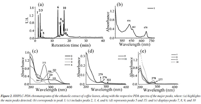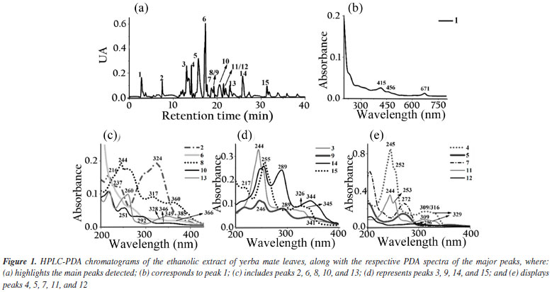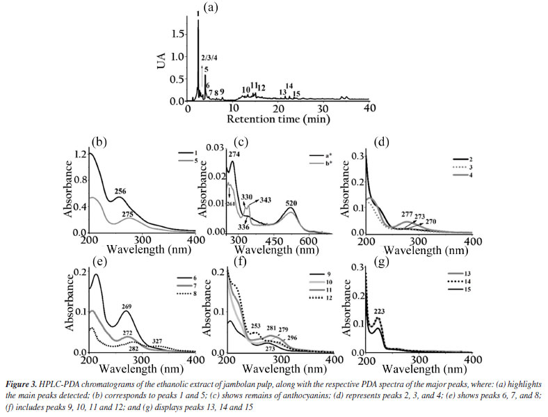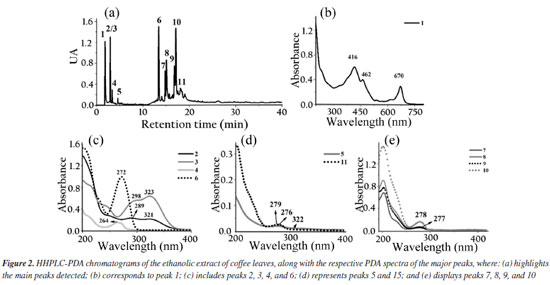 The biodiesel used presented average flash point of 176.7 ± 4.46 ºC, which increased to 185.7 ± 5.19 ºC with the adition of the extract. The Tukey test applied to the means showed no significant difference at the 5% level between the means of the flash point values, indicating that the addition of the extract did not significantly influence this parameter. It had specific mass at 20 ºC of 874.2 kg m-3, an acid number of 0.059 ± 0.017 mg KOH g-1, a cloud point of 10 ºC, a pour point of 5 ºC, a water content of 182.3 mg kg-1, a viscosity of 4.31 mm2 s-1 and an iodine value of 97.23 g I2 100 g-1.27 The assays demonstrate compliance within the specification parameters for B100 biodiesel according to current legislation specified in Brazilian Resolution 920.34 The ethanolic extracts of coffee leaves, jambolan pulp and yerba mate were analyzed for their total phenolic content using the Folin-Ciocalteu method. The results, expressed in mg of gallic acid equivalent per gram of dry mass, were as follows: coffee leaves extract contained 21.89 mg GAE g-1dry mass, jambolan pulp extract had 11.68 mg GAE g-1dry mass and yerba mate exhibited 25.03 mg GAE g-1dry mass. Frizon et al.35 used 111 samples of yerba mate from different regions of the state of Paraná, Brazil (Southeast, Center-South, and Metropolitan Region of Curitiba) and the samples analyzed by the Folin-Ciocalteu method showed total phenol content ranging from 23.07-168.50 mg g-1. Gregorio et al.23 studied the influence of the alcoholic coffee leaves extract on both the induction period and the thermodynamic parameters of biodiesel derived from soybean oil, but the total phenolic content revealed within the extract used was 12.472 mg of GAE g-1dry mass, lower value compared to the current study, 21.89 mg of GAE g-1dry mass. Analyzing the phenol content in in natura jambolan samples, at different maturation stages, Brandão et al.36 obtained values in the range of 208.30 to 338.89 mg 100 g-1. The concentrations of phenolic compounds were observed to be higher during the green stage, whereas tannins were more predominant in the green/purple stage. However, it is necessary to consider that certain variability in the composition of the raw material may occur due to factors such as plant cultivation conditions, harvest time and geographic factors. HPLC-PDA chromatograms were used to qualitatively explore the classes of chemical compounds present in the ethanolic extracts of yerba mate leaves, coffee leaves and jambolan fruit (Figures 1-3). The identification of characteristic spectral profiles for chemical classes, such as phenolic acids, flavonoids, and organic acids, was facilitated by analyzing the molecular absorption spectra. This analysis focused on the wavelength region of 190-800 nm, which corresponds to chromatographic peaks indicative of the physical separation of these components.