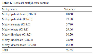 RESULTS AND DISCUSSION Biodiesel was produced through the transesterification reaction of a mixture containing equal parts of soybean and palm oils, using mathanol and potassium hydroxide as catalyst. Chromatographic analysis (GC-MS) revealed that the biodiesel used in the present study consists of methyl esters, with composition ranging from C16 to C22 (Table 1). The saturated fatty acid methyl ester content corresponds to 33.86% w/w of the biodiesel sample, while the unsaturated ones accounted for 62.99% w/w.