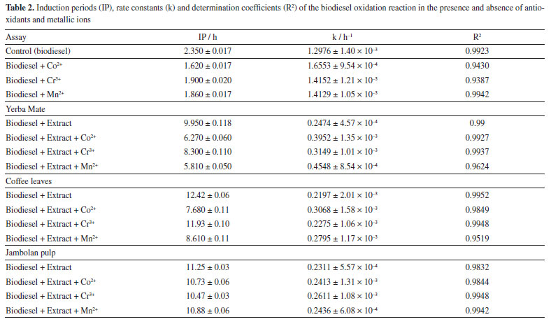 CONCLUSIONS The addition of alcoholic extracts with antioxidant properties led to an increase in the biodiesel induction period compared to the control sample. Notably, the coffee leaves extract had the most significant positive effect, extending the IP to 12.42 h. However, the presence of metallic ions such as chromium (Cr3+), manganese (Mn2+), and cobalt (Co2+), whether in combination with natural antioxidant extracts or not, decreased the IP in all tested scenarios. Specifically, the presence of Mn2+ ions had a pronounced impact on the biodiesel mixed with yerba mate extract, reducing its IP by 41.61%. The addition of extracts with antioxidant properties resulted in a decrease in the rate constant (k) of biodiesel oxidation compared to the control sample, which had a k value of 1.2976 h-1. Notably, the presence of natural extracts significantly reduced biodiesel oxidation, with the rate constant decreasing by 5.9 times in the presence of coffee leaves extract, resulting in a k value of 0.2197 h-1. Across all samples containing extracts with antioxidant properties, there was a consistent reduction in the rate constant, though to varying degrees compared to the control sample. When comparing the influence of metals and extracts with antioxidant properties, yerba mate extract showed the greatest interference from Mn2+, accelerating the oxidation reaction by 83.79%. Conversely, Cr3+ had the least influence on the oxidation process in the presence of coffee leaves extract, increasing the oxidation reaction rate by only 3.55%. Even though the biodiesel in the presence of coffee leaves extract showed a higher IP, the jambolan pulp extract exhibited the best antioxidant properties in the presence of metallic ions,