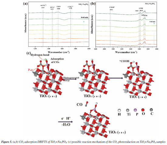CONCLUSIONS This study focuses on the TiO2+Na3PO4 photocatalyst, which demonstrates exceptional performance in reducing CO2. The incorporation of PO43- creates a rapid charge transfer channel (P-Ti-O) at the TiO2 interface. Additionally, this modification enhances the adsorption and activation of CO2 at Lewis basic sites. The analysis of in situ CO2 adsorption using DRIFTS under light irradiation suggests a reaction mechanism. It indicates that the combined effect of the directional charge transfer channel and the presence of abundant active sites significantly boosts the photocatalytic activity of the TiO2+Na3PO4 photocatalyst in CO2 reduction.