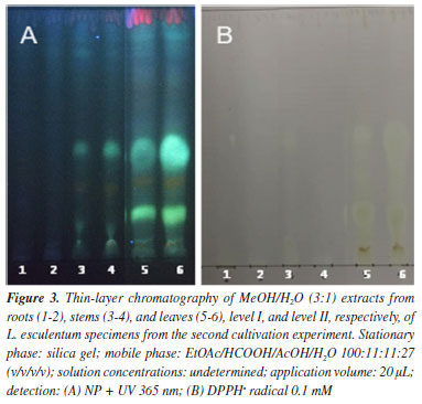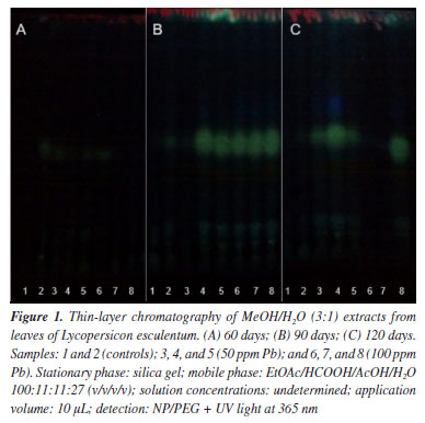 It is important to emphasize that the extraction, partitioning, and TLC analysis steps of the leaf extracts from all the specimens studied were conducted in the same manner, including the use of identical mass and volumetric quantities, as well as the volume applied to the chromatographic plates. This ensures the feasibility of discussing the relative quantities of each substance present in their chemical profiles as revealed by the chromatographic analysis. The cultivation time proved to be a determining factor in the production of the investigated substance, with low production observed at the 60-day cultivation time. On the other hand, the contamination level was only relevant for specimens cultivated up to 120 days, where a “homogeneity" of response was not observed. In other words, chromatographic plates exhibited bands with different intensities, indicating distinct concentrations. Consequently, aiming for a larger mass of plant material and/or extract and to ensure the reproducibility of the observed metabolic changes, it was decided to cultivate tomato specimens on a larger scale for a 90-day period under the same contamination conditions. The tomato specimens developed similarly to the previous experiment, showing structural normality and healthiness, with no significant differences observed between the cultivation conditions. The germination rates (37 and 46%, levels I and II, respectively) and survival rates (91 and 83%, levels I and II, respectively) calculated for the larger-scale cultivation were like those observed for the smaller-scale cultivation, suggesting good reproducibility of the experiment in this aspect, considering that the seeds used were from a different batch. Regarding the yield of plant biomass (level I - root: 4.5 g s.s.-1; stem: 34.3 g s.s.-1; leaves: 35.8 g s.s.-1; level II - root: 3.0 g s.s.-1; stem: 39.2 g s.s.-1; leaves: 22.8 g s.s.-1; where g s.s-1: mass in g of plant material (roots, stems, and leaves) per surviving specimen), a decrease in the amounts of leaf and stem tissues was observed with increasing contamination levels, as observed in the first cultivation experiment for specimens with 120 days. This decrease was not observed for specimens with 90 days in the first cultivation experiment (on a smaller scale); however, it should be noted that the sample size of the second experiment was increased by 10 times, with the sowing of 300 seeds. Thus, the increased perception of the decrease in leaf and stem masses was attributed to the larger number of individuals. The chromatographic profile of phenolic substances from specimens cultivated in the second experiment (Figure 3) highlighted the good reproducibility of the cultivation method, considering the production of the detected phenolic substance in plants grown in contaminated soil. Additionally, the analysis of hydro-methanolic extracts from the roots and stems of tomato specimens revealed the presence of the mentioned substance in smaller quantities in the stems of species cultivated under contamination, with its absence in the roots.