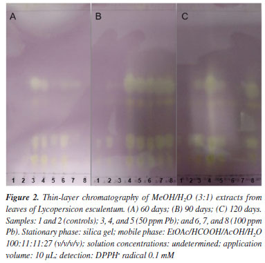 Nevertheless, regardless of concentration, the mere assimilation of metals can be considered a differentiating factor for tomato specimens cultivated under soil contamination conditions by FLs powder compared to control plants. This is due to the oxidative stress caused by the presence of these metals in the plant organisms under study, which may have relevance for implications in their metabolic pathways in all plant parts (roots, stems, and leaves). The metals were found throughout the extent of the tomato specimens, indicating the possibilities of translocation of these metals. Additionally, although the present study did not verify the presence of metals in the fruits due to non-fruiting, the possibility that soil contamination by FLs powder could be a factor in human contamination in nature, even under controlled cultivation conditions by tomato producers, cannot be ruled out. The presence of metals in all parts of the laboratory-cultivated specimens suggests the translocation of metals to the fruit, as reported in the literature.16,17,31 Considering the potential metabolic changes induced by metal assimilation, primarily Cd (Table 2), MeOH/H2O extracts (3:1 v/v) from the leaves of L. esculentum specimens were analyzed using TLC. This analysis revealed a differentiation in the production of phenolic substances, with the synthesis of a substance (yellow-green band under NP-UV 365 nm) whose concentration was significantly increased in plants cultivated in contaminated soil. The antioxidant activity of this substance was prominently demonstrated by its reaction with the DPPH• radical, consistent with an adaptive response of plants to oxidative stress caused by the contamination factor (Figures 1 and 2).