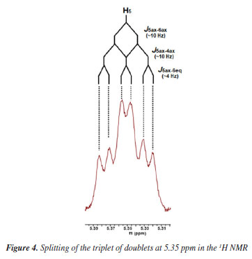 In a corroborative manner, correlations were observed in the COSY spectrum between the hydrogen at dH 5.35 ppm and hydrogens whose signals showed shifts at dH 3.56 (dd, J 3.1 and 9.8 Hz) and 3.78 ppm (d, J 3.9 Hz), where the couplings around 10 Hz were assigned to the couplings H-5 and H-6 (J5axial,6axial). H-5 and H-4 (J5axial,4axial), and around 4 Hz to the coupling between H-5 and H-6 (J5axial,6equatorial) (Figure 5).