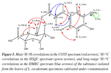 From the leaves of L. esculentum specimens cultivated under contamination at level II (2.61 g), the MeOH/H2O extract (3:1 v/v) was obtained (617.8 mg; yield of 23.7%), whose mass of 203.1 mg was subjected to solid-phase extraction technique, yielding a fraction enriched in the substance produced under contamination conditions (11.3 mg; 5.6%). The analysis of 1H NMR spectra (Figure 3S, Supplementary Material) and COSY correlations (Figures 7S and 8S, Supplementary Material) revealed the presence of two doublets at dH 6.28 ppm (J 15.9 Hz) and 7.56 ppm (J 16.0 Hz), indicative of olefinic hydrogens with trans- configuration and α, β to the carbonyl. Signals at dH 7.04 (d, J 2.0 Hz), dH 6.93 (dd, J 2.0 and 8.2 Hz). and dH 6.76 ppm (d, J 8.2 Hz) suggested the presence of a trisubstituted aromatic ring. Thus, a trans-alkene system of C6-C3 aromatic derivatives was proposed. These data led to the investigation of secondary metabolites present in the species under study, with chemical structures that exhibited the mentioned system, culminating in the suspicion that it was a derivative of quinic acid and hydroxycinnamic acids (or trans-cinnamic acids). The esterification of one or more hydroxylated sites of quinic acid with trans-cinnamic acids (cinnamic, coumaric, caffeic, ferulic, and dimethoxycinnamic) results in a class of secondary metabolites called chlorogenic acids.32 This implies the formation of a series of positional isomers for each trans-cinnamic acid. Normally, a plant contains the entire series of positional isomers of a particular acid, except for derivatives with esterification at position 1 of quinic acid, which are relatively rare. Therefore, many plants produce only derivatives with esterifications at positions 3, 4, and 5.33 The presence of oxy-methylene hydrogen at dH 5.35 ppm (td, J 4.6 and 10.4 Hz), with a splitting pattern (triplet of doublets) and coupling constant values suggesting vicinal couplings (3J) in six-membered carbon cycles (as observed in quinic acid), characteristic of axial-axial (two correlations) and axial-equatorial (one correlation) couplings34 (Figure 4), led us to hypothesize that the substance under analysis was a derivative of substituted quinic acid at position C-5, with H-5 in an axial position.