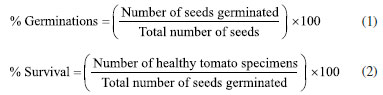 EXPERIMENTAL Cultivation soil The cultivation of tomato specimens (Lycopersicon esculentum Miller) was conducted using commercially acquired gardening soil (CAC Comércio Atacadista Ltda®, Brazil). For the characterization of the cultivation soil, three aliquots of 6 g each were sampled after sieving (≤ 2.0 mm) and homogenization by quartering. The samples underwent analysis using X-ray fluorescence (XRF) and energy-dispersive spectroscopy (EDS) coupled with scanning electron microscopy (SEM), in addition to organic matter analysis through thermogravimetry. The XRF analysis was carried out utilizing an X-ray fluorescence spectrophotometer, model AxiosMax from Panalytical (Netherlands, UK), operating in standalone mode. The samples were prepared in a Fluxana VANEOX automatic press (20 mm mold, P = 20 tons, and time = 30 s), using boric acid (H3BO3) in a 1:0.3 ratio (2 g of dry sample at 105 ºC and 0.6 g of H3BO3). The analysis employing energy dispersive X-ray spectroscopy (EDS) coupled to scanning electron microscopy (SEM) was carried out utilizing a Quanta 250 microscope equipped with a Centaurus detector and EDS detector. The instrument operated at a voltage of 20 kV and a magnification of 1,200×. Thermogravimetric analysis (26.693 mg of sample) was conducted using a TA Instruments (New Castle) apparatus, model TGA Q500 V6.7 Build 203, under an inert N2 atmosphere with a flow rate of 40.0 mL min-1 for the carrier gas and 60.0 mL min-1 for the sample. The heating range spanned from 29.18 to 695.48 ºC, with a heating rate of 10 ºC min-1. Mass loss and kinetics of manipulation (derived) results were obtained using Universal Analysis 200 v.4.2.0.38 software from TA Instruments. The description of the cultivation soil characterization stage can be found in the Supplementary Material file. Fluorescent lamp powder and soil contamination The fluorescent lamp (FLs) powder was provided by a Brazilian company specializing in the treatment of this residue from various brands and batches. The residual Hg concentration was determined to be 3.0 ± 0.2 mg kg-1.6 Given the low concentration of Hg and the sample preparation procedure (“Determination of potential toxics elements assimilation" sub-section), this study did not consider Hg during the quantification of potentially toxic elements translocated to the cultivated specimens. Consequently, the levels of contamination from FLs powder were parameterized based on Pb, which, along with Cd, exhibits high cytotoxicity for plants.24 For the preparation of soil contamination, homogenization and quartering were carried out using a prismatic pile.25 Level I (50 mg kg-1 of Pb): 5400 g of soil and 174.20 g of FLs powder residue; Level II (100 mg kg-1 of Pb): 5400 g of soil and 348.41 g of FLs residue. The calculation used overestimates the concentration of Pb, considering that 1550 mg of Pb is available, ensuring that the actual concentration is below 100 mg kg-1 of Pb. According to exploratory studies, it is concluded that above this limit, plant growth was impaired. The quantity of lead was parameterized based on previous quantifications performed by the research group in the FLs powder used.6 Plant material The tomato seeds (Lycopersicon esculentum Miller; Santa Clara variety, 99.9% purity and 80% germination rate) were purchased from TOPSEED®. Two different batches of seeds were used: the germination test and the first cultivation experiment were conducted with the batch 050302 (expiration date: February 2019); and the second cultivation experiment was conducted with the batch 082804 (expiration date: February 2024). In addition to the aforementioned information, the product packages (seeds) contained the following details: optimal cultivation period for the State of Rio de Janeiro region - March to October; soil sowing depth - 1 cm; harvesting time - 100 to 110 days after sowing. The cultivation of Lycopersicon esculentum specimens was conducted at the Laboratory of Integration in Analytical Technology (LabITAn) at the Institute of Chemistry, UFRJ. At all stages of cultivation, tomato specimens were exposed to the same conditions of humidity, temperature, and lighting, being watered daily with identical amounts of water. Germination and survival rates were calculated using Equations 1 and 2. ![]() Germination test of L. esculentum seeds A total of 10 tomato seeds were added to 50 mL plastic pots containing 20.0 g of previously treated soil (non-contaminated - control and contaminated with FLs powder at levels I and II). The pots were watered daily with distilled water until complete germination (experiment concluded 30 days after sowing). First cultivation experiment - smaller scale For the first cultivation experiment, conducted on a small scale, 300 g (in 700 mL polypropylene vases) of previously treated soil (non-contaminated - control, and contaminated with FLs powder at levels I and II) were seeded with 30 seeds, arranged at approximately 1 cm depth. Vase watering was carried out with distilled water. This cultivation experiment was conducted in triplicate. Tomato specimens were collected after 60, 90, and 120 days from planting. After removing the plants from the plastic pots, the roots were washed with distilled water and carefully dried using absorbent paper. Subsequently, plant parts (root, stem, and leaf) were separated, and the samples were dried in an oven at 40 ºC for 72 h. The masses of the dried plant material were measured using an analytical balance. The samples were frozen with liquid nitrogen, comminuted using a mortar and pestle made of marble, and then stored in conical tubes under refrigeration. The weight data for each plant replicate parts were statistically analyzed using the Grubbs Test for outliers (α = 0.05), and the approved values were grouped into means for subsequent graphical analysis. To compare the dehydrated masses of the different parts (leaf, stem, and root) of the cultivated specimens, an analysis of var