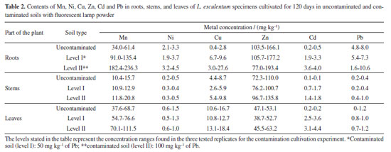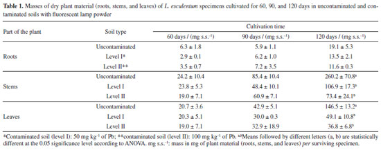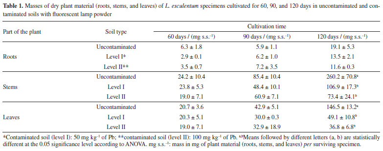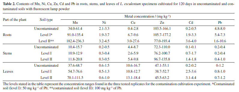 RESULTS AND DISCUSSION In previous studies conducted by the research group,29 a negative influence, primarily of the metals Pb and Cd, was observed at concentrations between 25-100 mg per kg of soil during the seed germination stage of L. esculentum, rendering it impractical to investigate the influence of these metals on the development of plants of the mentioned species from the germination stage. However, since the availability of metals in the FLs powder depends on their form in the residue, the present study focused on investigating the germination viability (germination test) in soils contaminated with FLs powder at concentrations nominally set at 50 and 100 mg kg-1 of Pb, labeled as levels I and II, respectively. As a control against normal cultivation conditions, i.e., without FLs powder contamination, negative control was conducted (cultivation in uncontaminated soil). The potentially toxic metals from the fluorescent lamp powder in the cultivation soil were not detected through SEM/EDS and XRF techniques (Supplementary Material). The total organic carbon content (TOC, %) was determined by thermogravimetry at 2.61%,30 (Supplementary Material). The preliminary stage of assessing the germination viability of L. esculentum seeds in contaminated soil revealed that the presence of FLs powder in the cultivation soil did not pose a hindrance, considering the similarities in germination time and morphological aspects of the specimens. Although the calculated germination rates were lower than expected based on seed specifications (germination rate equal to 80%), this behavior could not be solely attributed to FLs powder contamination. This is evident as the observed germination rates were lower for the replicates of the control plants (23%) compared to the contaminated plants (53 and 60% for levels I and II, respectively). It is noteworthy in this case that the primary matrix of FLs powder is composed of phosphates, which, in turn, may have influenced the higher germination rates calculated for the two contamination levels. As commercial seed specifications for L. esculentum indicated a harvest time of 100 to 110 days after sowing, the study proceeded with the cultivation of tomato specimens under the three aforementioned conditions for durations of 60, 90, and 120 days. However, the development of flowers and fruits was not observed in specimens cultivated up to 120 days, and this phenomenon could not be attributed to contamination, as the negative control exhibited the same behavior. Regarding germination rates (23, 34, and 32% for the control, level I, and level II, respectively) and survival (100% for all cultivation media) of tomato specimens, the values were similar to those observed in the germination test. The morphological analysis of the plants, assessed through the dry plant masses per surviving specimen (mg s.s.-1), did not show statistical differences between specimens cultivated in contaminated and uncontaminated soils at 60 and 90 days. At 120 days, a statistical difference was observed between specimens cultivated in different types of soils - uncontaminated and contaminated soils (Table 1). Possibly, a longer contact time with FLs powder led to atrophy in the above ground parts of the specimens. The roots did not show significant differences. Under none of the cultivation conditions did flowering and fruiting occur, suggesting that soil mass and the laboratory atmosphere were contributing factors to this behavior.