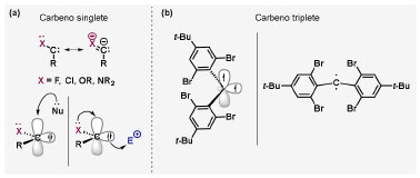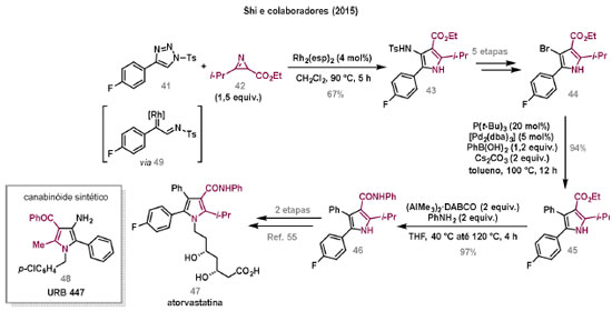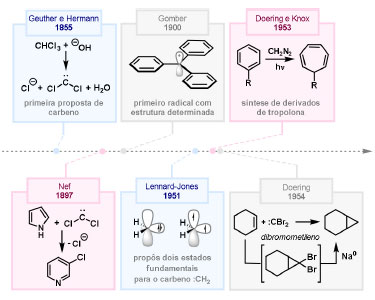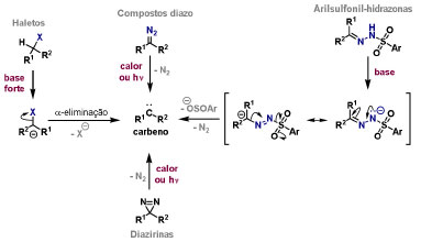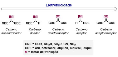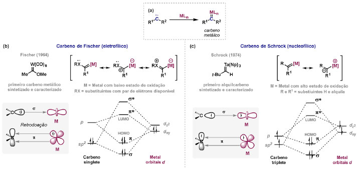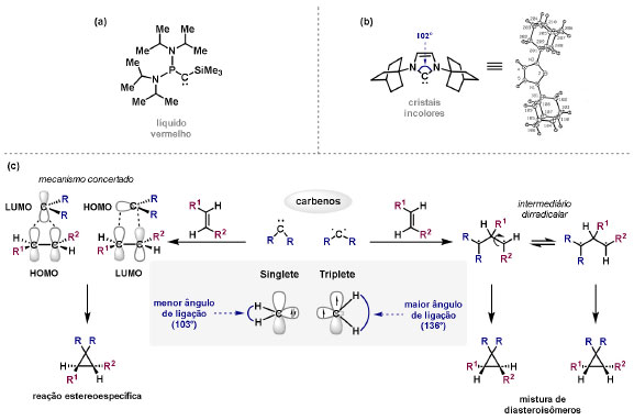 Vinícius V. Souza; Cristiano Raminelli* Departamento de Química, Instituto de Ciências Ambientais, Químicas e Farmacêuticas, Universidade Federal de São Paulo, 09972-270 Diadema - SP, Brasil Recebido: 28/10/2024 *e-mail: raminelli@unifesp.br The study of carbenes and metal carbenes has attracted researchers from different countries due to the versatility of these reactive species in preparative organic chemistry. In this review, we discuss the structural aspects, reactivity, and formation methods of carbenes, which provide theoretical support for understanding the structure/reactivity relationship of metal carbenes, whose classifications and formation methods have been presented. Emphasis is placed on the class of α-imino metal carbenes, which have allowed the construction of various heterocyclic compounds, including alkaloids with complex structures. Total and formal syntheses of nitrogen-containing compounds using α-imino metal carbenes from N-sulfonyl-1,2,3-triazoles have been reviewed. In this regard, an overview of the synthetic routes established in these works, including the key reactions highlighted by the authors, has been provided. INTRODUÇÃO O estudo de carbenos, especialmente na presença de metais de transição, tem atraído pesquisadores de todo mundo, devido à formação de espécies conhecidas como carbenos metálicos ou metal carbenos.1 Neste artigo de revisão, pretendemos abordar características estruturais, a reatividade e métodos de formação de carbenos, para dar suporte teórico para a compreensão da relação entre a estrutura e a reatividade de carbenos metálicos, além de apresentar suas classificações e métodos de geração, visando demonstrar a grande versatilidade desses intermediários organometálicos em química orgânica preparativa. Daremos ênfase à classe dos α-iminocarbenos metálicos, os quais têm permitido a construção de diversos compostos heterocíclicos nitrogenados,2 incluindo alcaloides com estruturas complexas.3 Neste trabalho em particular, apresentaremos 11 (onze) estudos contendo sínteses totais e formais, envolvendo α-iminocarbenos metálicos derivados de compostos N-sulfonil-1,2,3-triazólicos, as quais serão delineadas de maneira a dar uma visão geral das rotas sintéticas desenvolvidas, trazendo as reações chaves destacadas pelos autores. CARBENOS A primeira suposição da existência de um carbeno foi feita em 1855 por Geuther e Hermann.4 Foi sugerido que a hidrólise alcalina do clorofórmio prosseguia através da formação de um intermediário de reação com um carbono divalente chamado diclorocarbeno. Posteriormente, em 1897, Nef5 propôs o mesmo intermediário na transformação entre pirrol e clorofórmio em 3-cloropiridina. Naquela época, a proposta da existência de carbenos como intermediários foi muito ousada, pois ainda não se sabia da existência de radicais livres. Foi somente em 1900 que os radicais livres foram descobertos, ou seja, através de experimentos de análise elementar realizados por Gomberg,6 a estrutura para o radical trifenilmetileno foi determinada. No entanto, o interesse pelos carbenos foi reavivado apenas no início da década de 1950 com Lennard-Jones e Pople,7 que propôs os estados singlete e triplete para carbenos. Em 1953, Doering e Knox8 reportaram a síntese de tropolonas por meio da adição de carbeno metileno a benzenos substituídos com grupos alquila. Entretanto, a contribuição mais significativa de Doering e seus colaboradores9 veio um ano depois, quando relataram a primeira reação de ciclopropanação entre bromofórmio e alcenos via intermediário dibromometileno (Esquema 1). Carbenos são espécies neutras reativas que contêm um átomo de carbono divalente com uma camada de valência de seis elétrons, com dois pares de elétrons formando ligações e dois elétrons não ligantes.10 No entanto, existem alguns carbenos estáveis que podem ser isolados e caracterizados, tais como os estabilizados por substituintes contendo fósforo e silício (Esquema 2a) e carbenos N-heterocíclicos, cuja estrutura foi confirmada em 1991, por cristalografia de raios-X11 (Esquema 2b). Os carbenos podem existir nos estados singlete e triplete. O estado singlete apresenta dois elétrons não ligantes emparelhados em um orbital sp2 e um orbital p vazio, com um ângulo de ligação de aproximadamente 103° para o carbeno metileno.12 O estado triplete, com um ângulo de ligação de aproximadamente 136° para o carbeno metileno, apresenta dois elétrons não ligantes desemparelhados em orbitais distintos, um em orbital sp2 e outro em orbital p.13 Ambos os estados eletrônicos exibem geometrias angulares e reatividades distintas. Um exemplo clássico é a reação de ciclopropanação entre carbenos e alcenos, em que o mecanismo da reação está diretamente relacionado com o tipo de carbeno. Um carbeno singlete, com elétrons emparelhados em orbital sp2 e orbital p vazio, realiza uma reação de cicloadição através da sobreposição de orbitais de fronteira HOMO (em inglês, highest occupied molecular orbital) e LUMO (em inglês, lowest unoccupied molecular orbital), por meio de uma única etapa concertada, favorecendo a formação de um único estereoisômero. Por outro lado, um carbeno triplete atua como um radical e reage via mecanismo por etapas, através da formação de um intermediário dirradicalar, que possui uma rotação livre na ligação C-C, favorecendo a formação de uma mistura de diasteroisômeros14 (Esquema 2c). Estudos experimentais e teóricos dos orbitais moleculares do carbeno metileno indicam que o estado triplete apresenta uma energia aproximadamente 8,5 kcal mol-1 mais baixa do que o estado singlete.15 Contudo, a estrutura e o método empregado para a geração de um determinado carbeno definirá em qual estado ele será formado. A multiplicidade do carbeno depende do solvente em que ele é formado, onde solventes mais polares coordenantes doam