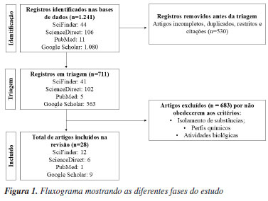 METODOLOGIA Para realizar a busca acerca das substâncias isoladas, perfis químicos e atividades biológicas do gênero Remijia DC. foram utilizadas as bases de dados SciFinder, ScienceDirect, PubMed e Google Scholar para complementar o estudo, inserindo o termo "Remijia". Como critérios de inclusão, foram selecionados apenas estudos com isolamento de substâncias, perfis químicos e atividades biológicas de espécies de Remijia. Foram obtidos 1.241 artigos de pesquisas, livros, dissertações, teses e trabalhos de congressos publicados até outubro de 2024. Foram removidos 530 artigos incompletos, duplicados, restritos e citações e 683 por não obedecerem aos critérios de inclusão, ao final 28 referências foram utilizadas para compor o presente trabalho (Figura 1). As estruturas químicas relatadas foram desenhadas usando o software ChemDraw 18.1 (PerkinElmer, EUA, 2019) com auxílio das bases de dados SciFinder e PubChem.