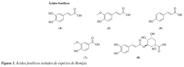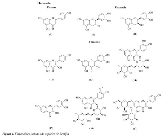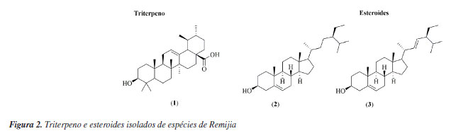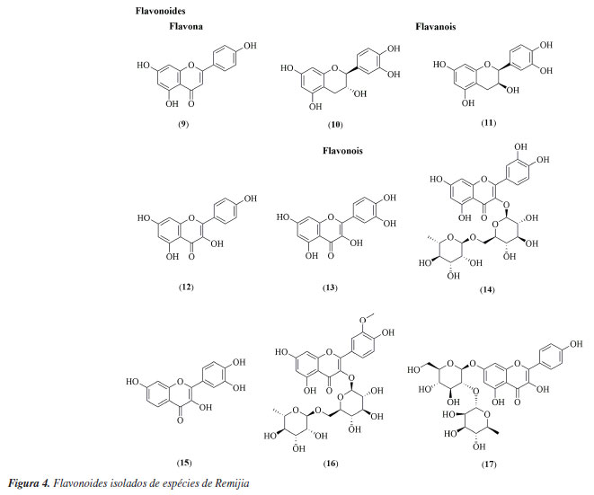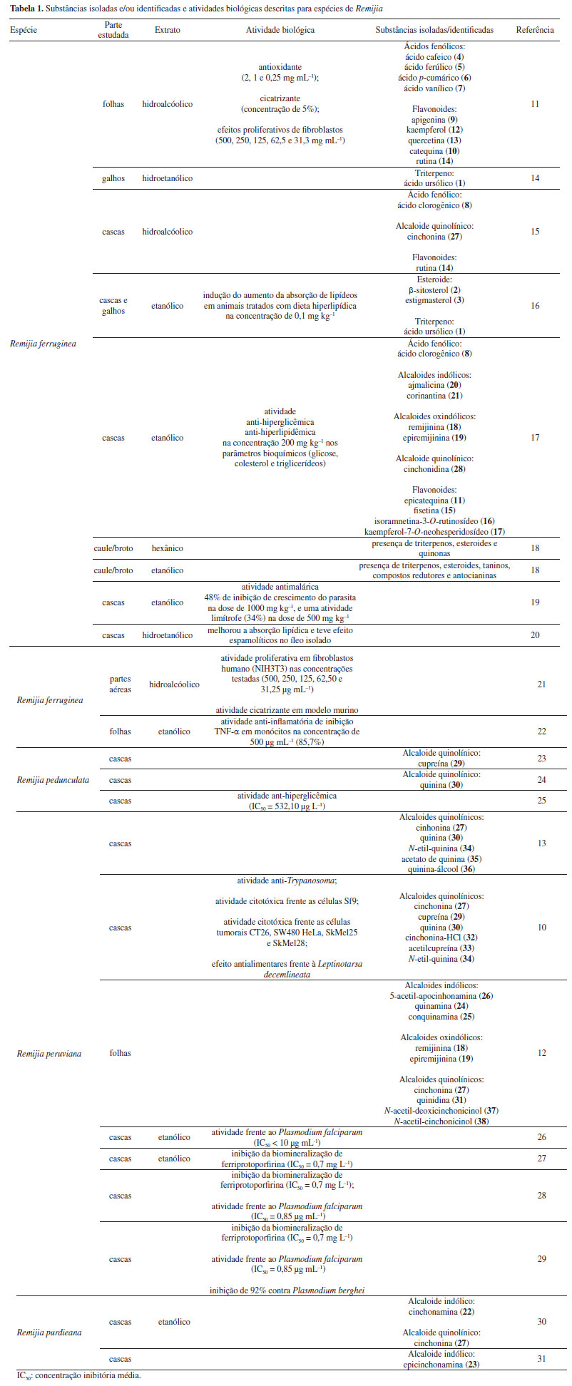 Remijia ferruginea (A.St.-Hil.) DC. Remijia ferruginea (A.St.-Hit.) DC., conhecida popularmente como quina-mineira, quina-de-remijio e entre outros é a espécie mais conhecida do gênero. O fitoterápico brasileiro Ierobina® é constituído dos extratos de Remijia ferruginea (A.St.-Hit) DC., Solanum paniculatum L., Jacaranda caroba (Vell.) DC. e Erythraea centaurium (L.) Borkh. Braga et al.14 analisaram a composição química dos extratos que constituem o fitoterápico Ierobina® e observaram a presença de ácido ursólico (1) no extrato hidroetanólico dos galhos de R. ferruginea. Sarandy et al.11 avaliaram os extratos hidroalcóolicos de folhas e observaram a presença de diversas substâncias fenólicas como ácido cafeico (4), ácido ferúlico (5), ácido p-cumárico (6), ácido vanílico (7), e flavonoides de diferentes classes, como a flavona apigenina (9), flavanois como catequina (10) e rutina (14) e os flavonois kaempferol (12), quercetina (13) e rutina (14). Por sua vez, do extrato hidroalcóolico das cascas foram identificadas a rutina (14), ácido clorogênico (8) e cinchonina (27).15 Valadares16 isolou e caracterizou as seguintes substâncias a partir dos extratos etanólicos de cascas e galhos: ácido ursólico (1), β-sitosterol (2) e estigmasterol (3). Posteriormente, Cosenza et al.17 identificaram no extrato etanólico das cascas a presença das seguintes substâncias: ácido clorogênico (8), epicatequina (11), fisetina (15), isoramnetina-3-O-rutinosídeo (16), kaempferol-7-O-neohesperidosídeo (17), remijinina (18), epiremijinina (19), ajmalicina (20), corinantina (21) e cinchonidina (28). Rodrigues et al.18 analisaram os extratos hexânicos e etanólicos do caule/broto e observaram indícios de terpenos, esteroides e quinonas no extrato hexânico e triterpenos, esteroides, taninos, compostos redutores e antocianinas no extrato etanólico. Em relação à atividade biológica, Sarandy et al.11 analisaram a capacidade antioxidante, cicatrizante e efeitos proliferativos de fibroblastos do extrato hidroalcoólico das folhas de Remijia ferruginea. A análise da capacidade antioxidante foi realizada utilizando a metodologia DPPH (2,2-difenil-1-picril-hidrazila) e apresentou uma alta taxa de sequestro nas concentrações de 2, 1 e 0,25 mg mL-1 quando comparado aos controles (rutina e butil-hidroxitolueno). O ensaio de proliferação de fibroblastos (in vitro) foi realizado em linhagem celular de fibroblastos murinos (NIH3T3) nas concentrações de 500, 250, 125, 62,5 e 31,3 mg mL-1 e os resultados apresentados mostraram maior atividade proliferativa de fibroblastos do que no controle positivo (meio de cultura + células) em todas as concentrações. Os fibroblastos ocasionam um estresse na matriz extracelular estimulando a secreção de proteínas, como o colágeno, auxiliando na contração de feridas. O extrato hidroalcoólico de R. ferruginea estimulou a proliferação de fibroblastos. O teste cicatrizante (in vivo) foi realizado durante 21 dias em modelo murino através de pomadas contendo o extrato hidroalcoólico de R. ferruginea nas concentrações de 1% (1 g), 3% (3 g) e 5% (5 g). Como controle positivo foi usada a pomada Fitoscar® e como controle negativo foi usado o veículo de pomada. As pomadas de R. ferruginea foram avaliadas pela primeira vez para cicatrização e promoveram a maturação do colágeno em feridas e também modularam as defesas antioxidantes endógenas. Os resultados indicaram que as três doses testadas de extrato hidroalcoólico de R. ferruginea (1, 3 e 5%) puderam modular o processo de reparação da pele, e que os melhores efeitos foram observados após a exposição à dose mais alta. Andrade-Neto et al.19 analisaram a atividade antimalárica in vivo do extrato etanólico das cascas de R. ferruginea contra Plasmodium berghei, em modelo murino. Como controle positivo um grupo foi tratado com doses baixas de cloroquina (≤ 25 mg kg-1) e para controle negativo, um outro grupo foi mantido sem tratamento. O experimento causou até 48% de inibição de crescimento do parasita na dose de 1000 mg kg-1, e uma atividade limítrofe de 34% na dose de 500 mg kg-1, enquanto a cloroquina apresentou uma redução significativa de parasitemia (51-95%). Cosenza et al.17 avaliaram o potencial citotóxico, anti-hiperglicêmico e anti-hiperlipidêmico das cascas de R. ferruginea e os resultados não apresentaram citotoxidade nas concentrações de 1, 10, 100 e 1000 µg mL-1 frente as células renais (BMG) isoladas de mamíferos. Nos testes anti-hiperglicêmico e anti-hiperlipidêmico realizado com os camundongos nas concentrações de 50, 100 e 200 mg kg-1, o extrato mostrou redução apenas na dose de 200 mg kg-1 nos parâmetros bioquímicos (glicose, colesterol e triglicerídeos). O extrato etanólico de R. ferruginea induziu a absorção de lipídeos em ratos tratados com dieta hiperlipídica na concentração de 0,1 mg kg-1, além disso, o extrato apresentou um aumento da atividade da lipase lipoproteica.16 A análise de Ierobina® em ratos melhorou a absorção lipídica e teve efeitos espasmolíticos no íleo isolado, contudo, o fitoterápico conta em sua composição com extrato de Solanum paniculatum L., Jacaranda caroba (Vell.) DC. e Erythraea centaurium (L.) Borkh, ou seja, o extrato etanólico de R. ferruginea pode não ser a única responsável pela atividade biológica.20 Diaz et al.21 analisaram uma composição farmacêutica do extrato hidroalcoólico das partes aéreas do R. ferruginea em testes in vitro e in vivo. O teste in vitro foi realizado em culturas celulares de fibroblastos humano (NIH3T3) e apresentou atividade proliferativa de fibroblastos maior que o controle positivo (soro fetal bovino (SBF 5% e 10%) em todas as concentrações testadas (500, 250, 125, 62,50 e 31,25 µg mL-1). O teste in vivo foi realizado em modelo murino durante 21 dias com 4 dias de coleta (3º, 7º, 14º e 21º). Os resultados mostraram que nos dias de cole