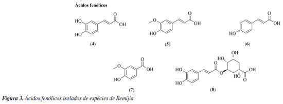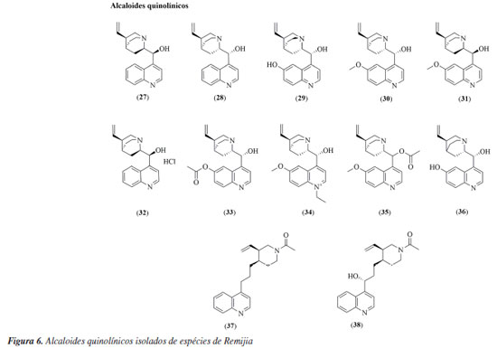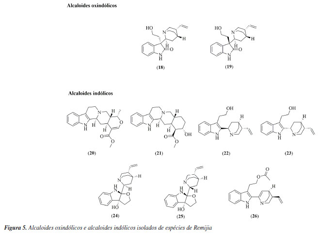 RESULTADOS Pelo levantamento bibliográfico realizado, das 43 espécies de Remijia apenas 4 foram investigadas em estudos químicos e biológicos, sendo elas: Remijia ferruginea (A.st.Hil.) DC., Remijiapedunculata (H.Karst.) Flueck., Remijia peruviana Standl. e Remijia purdieana Wedd. Estas espécies apresentaram diferentes atividades biológicas e foram identificadas/caracterizadas 38 substâncias pertencentes a diversas classes químicas, como mostradas na Tabela 1 e nas Figuras 2 a 6. A seguir estão citados os resultados obtidos para cada uma das espécies estudadas.