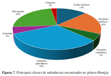 CONCLUSÕES Os estudos químicos e biológicos realizados com espécies de Remijia spp. permitiram identificar 38 substâncias de diversas classes químicas como: alcaloides quinolínicos, alcaloides indólicos, alcaloides oxindólicos, flavonoides, ácidos fenólicos, esteroides e triterpeno. Seus extratos e substâncias demostraram ter atividade antioxidante, atividade anti-inflamatória de inibição TNF-α, antiplasmodial, cicatrizante, citotoxicidade, anti-Trypanosoma cruzi, antialimentares, antimalárica, anti-hiperlipidêmica, anti-hiperglicêmica e inibição da ferriprotoporfirina IX. A grande preferência observada pelas espécies de Remijia estudadas até o momento pela produção de alcaloides do tipo quinolínicos e indólicos indicam ser os marcadores quimiossistemáticos do gênero.