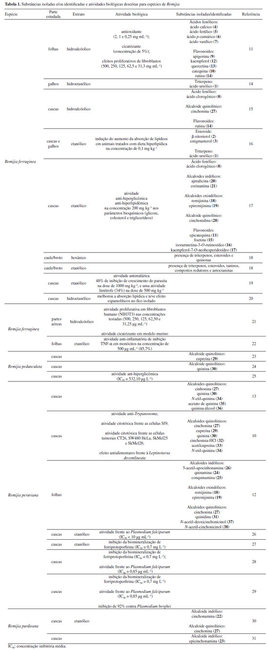 | Constituintes químicos e atividades biológicas de Remijia DC. (Rubiaceae): uma revisão Chemical constituents and biological activities of Remijia DC. (Rubiaceae): a review |