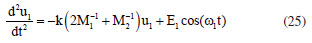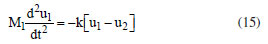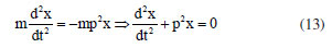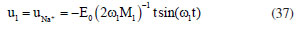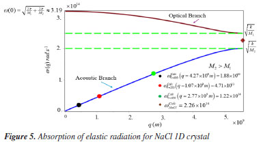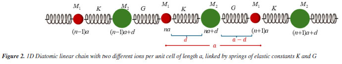 The RMLDM model does not provide any information about the normal modes of vibrations of each ion in the 1D unitary cell of the Na+Cl- bond. Let us consider in Figure 3 that the masses M1 and M2 represent, respectively, the sodium and chloride ions. Supposed that in t = 0, the ions sodium and chloride are in equilibrium, that