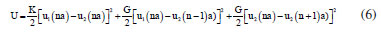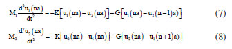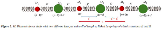 The distance between two adjacent points of a maximum or minimum of that wave is the wavelength (λ) in meters (m) and speed of propagation in vaccum equal c = 3.0 × 10-8 m s-1. The frequency n is given in Hertz (Hz) or number of cycles per second, where: ![]() For chemistry, vibrational spectroscopy, according to Pavia et al.,1 uses infrared radiation with wavelengths range at 2.5 and 25.0 (× 10-6 m). The classical energy of harmomic oscillator is given by ![]() where h = 6.6262 × 10-34 J s is the Planck's constant.7 Therefore, from Equation 2 the wave energy is directly proportional to frequency. Most chemists prefer vibrational infrared radiation in terms of wavenumber ![]() instead of using the wavelength,1 since from Equations 1-3 we can write ![]() that is, the energy is directly proportional to the wavenumber of the radiation. From Equations 1-3, we have ![]() The infrared region is where the spectral lines of radiation absorption related by molecular vibrations are found and, according to Rodrigues3 "can be subdivide in three regions The linear crystal 1D with diatomic base Let us consider a one-dimensional linear diatomic chain with two ions per unit cell with equilibrium positions: na and na + d, with d ≤ 0.5a, where the force of attraction of neighboring ions depends only on their distances d or a - d, being K and G the elastic constants of each spring. This chain constitutes a Bravais lattice, whose vectors are of type ℜ = na, for some integral n. Those assumptions were made by Ashcroft and Mermin,7 for a diatomic chain with the same atoms or ions, but in this study were also assumed for different atoms or ions. Furthermore, we will also assume that the atoms or ions in this chain oscillate around their average equilibrium position and that the displacements are small when compared to the interatomic distances between the neighboring ions. With this hypothesis we have the harmonic approach to the representation of crystal lattice dynamics where, according with Ashcroft and Mermin:7 "accurate quantitative results are obtained and are often in good agreement with observed solid properties" (p. 422). As d ≤ 0.5a, we have a ≥ 2d ⇒ a - d ≥ d ⇒ K ≥ G, that is, the strength of pairs separated by d distant being greater than that of separated by a - d distance. Figure 2 shows a diatomic linear chain with two different ions per unit cell in these equilibrium positions.