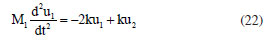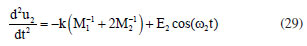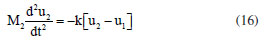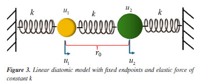 Let us assume that interactions only occur between the closest neighbors. This condition was proposed by Max Bohr, in 1912, for the study of longitudinal vibrations of alternating chloride and sodium atoms.5 The potential energy of the system is then given by ![]() where u1 (na) is the ion displacement of M1 mass that oscillates about the site or position na and u2 (na) is the ion displacement of M2 mass that oscillates about the site na + d. Using the Lagrangian of the system4 we have the equations for the displacements u1 (na) and u2 (na), respectively, given by ![]() The solutions are of type ![]() and ![]() where C1 and C2 are the constants to be determined, q is the wavenumber and ω is the circular frequency. Replacing the Equations 9 and 10, respectively, in Equations 7 and 8 results the dispersion equation given by ![]() If M1 ≠ M2 and k = K = G, so d = 0.5a, and the Equation 11 can be written as ![]() The Equation 12 shows that the wave oscillation frequency depends on the wavelength of the radiation, or the wave vector q. The Equation 12 also represents two curves ω vs. q which refer to the optical branch, if the positive signal is used, or the acoustic branch in opposite case. The optical branch is associated with long wavelengths and has this name because ionic crystals can interact with electromagnetic radiation, while the acoustic branch has this name because the dispersion relationship is in the form ω = cq, which is characteristic of sound waves for small values of q where the region πa-1 ≤ q ≤ πa is called first Brillouin zone (BZ) that is the region of the interest.7 The classical harmonic oscillator Consider a particle of mass m moving along the 0x-axis that is being attracted to the origin through controlling force F = -mp2 xj, which varies with the distance x. So, the equation of the movement is given by ![]() where p is a real constant. The general solution of this equation is given by ![]() what characterizes a simple harmonic movement, that is; the equation of this movement is the classical harmonic oscillator.4 The classical models Two models of harmonic oscillators are used in this study to represent the vibrational movements of NaCl molecule. Setting G = 0 and n = 0 in Equations 7 and 8 results in the equations of vibrational motion ![]() and ![]() where the solutions of Equations 15 and 16 are given directly from Equation 9, i.e., u1 = C1ei(-ωt) and u2 = C2ei(-ωt), with these solutions being able to be written as u1 = A1 cos(ωt) + B1 sin(ωt) and u2 = A2 cos(ωt) + B2 sin(ωt), where u1 and u2 represent standing waves in simple harmonic movement (SHM) that is, as a linear combination of the sine and cosine functions. As the objective is to analyze only the structural vibrational movements of axial deformation of linear diatomic molecules, that is, the asymmetric stretching mode, it is necessary to eliminate the translational movement of the molecule so that the center of gravity of the system is fixed. For this to happen, the linear resulting momentum must be zero,5 i. e., ![]() Therefore, u1 and u2 vibrate with the same fundamental frequency ω and in opposite directions. From Equations 15 and 17, a single equation results, given by ![]() whose solution is a stationary wave u1 = A1 cos(ω1t) + B1 sin(ω1t), being ![]() the fundamental circular frequency, while natural frequency of vibration v1 is given by ![]() and µ = (M1M2) × (M1 + M2)-1, the reduced mass of the system.8 Once the u1 movement is known, the u2 movement can be obtained using Equation 17, where both movements have the same frequency as the u1 movement. From Equations 5 and 20 we have the wavenumber ![]() This model for molecular vibrations of longitudinal linear diatomic bonds presented here, in this study, will be called by us as reduced mass linear diatomic model or simply RMLDM. Other authors3,9 developed this same model, but using other methodological approaches. Figure 3 shows a linear diatomic molecule with fixed ends and springs with the elastic constant k.