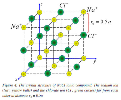 RESULTS AND DISCUSSION Figure 4 shows the crystal structure of NaCl. This structure is a face-centred cubic Bravais lattice with a diatomic basis consisting of a sodium ion at 0 position and a chloride ion at the centre of the conventional cubic cell with the reticular parameter a = 5.64 × 10-10 m.7