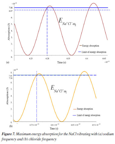 The energy data estimated by the LDM model and those obtained by Equation 34 are also in good agreement, except in level n = 0. The LDM model can estimate the energies abosorbed by each ion of the NaCl molecule when exposed to IR radiation. Although the LDM model is just a simplification of vibrational reality, it provides good approximations for this complex understanding. Tables 1 and 2 show that these radiation absorptions in the IR are in good agreement with the absorption range given by Pavia et al.,1 1.32 → 6.64 (× 10-20) J or between 8 → 40 kJ mol-1. And according to this author, "the absorbed energy increases the amplitude of the vibrational movements of the bond in the molecule" (p. 17). From a point of view of the classical mechanics a more realistic representation of the energy absorption wave is not realistic when large time intervals are used, but a pictorial representation of this phenomenon can be applied, in a restrict way, to provide some more data of interest. Figure 7a shows the energy absorption of the sodium and chloride ions with the same frequency of sodium, while the Figure 7b shows the energy absorption of the sodium and chloride ions with the same chloride frequency. It can be noted that the sodium ion absorbs energy more quickly than chloride ion.