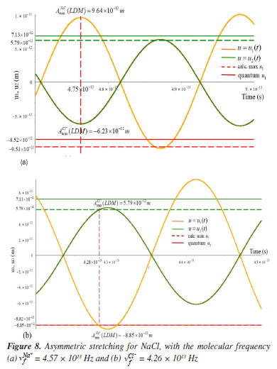 The blue dotted line acts as a superior limit to energy gains by the molecular varying between 7.0 × 10-20 and 7.5 × 10-20 J. These lines represent the theoretical maximum quantum energy admitted for the NaCl molecule with each vibrational frequency. From the maximum absorption energies of NaCl molecule, the maximum vibrational amplitudes of each ion of the molecular bond can be estimated using Equations 41 and 42. For NaCl with the molecular frequency, νfNa+ = 4.57 × 1013 Hz we have approximated the energies of each ion, as well as the vibrational amplitudes at the quantized energy level n = 2 given by and . The quantum amplitudes and were calculated using the Schrödinger equation14 given by ![]() where UQ is the vibrational amplitude of the ion at quantum level n, ω is the circular frequency and µ is the reduced mass of the ion in molecule. The estimates of the vibrational amplitudes for the sodium and chloride ions at level n = 2 is within the range of absolute amplitudes of the normal modes of vibration that vary, according Rodrigues,3 in the range 1 → 10 × 10-12 m. This extension also represents the admissible percentage for variation amplitudes in relation to the bond length between the sodium and chloride ions. In fact, the greatest vibrational amplitude was for sodium ion at = 9.53 × 10-12 m that is nearly 4.1% r0, where r0 = 2.28 × 10-10 m is the the bond length of NaCl. The maximum energy absorption of NaCl with the molecular frequency, νfC1- = 4.26 × 1013 Hz, can also be estimated by the LDM model The results of the maximum vibrational amplitudes for sodium and chloride ions are nearly the average vibration amplitude of the lattice, given by U0 = 6.17 × 10-12 m. This estimate was obtained using the Equation 31 reported by Kittel16 and not showed here. The results show that the vibrational amplitudes in n = 2 level are in good agreement with the sodium ion and in reasonable agreement with the chloride ion. Figures 8a and 8b show asymmetric stretching model for the NaCl molecule at the quantum level n = 2 with the two normal vibration modes. In Figures 8a and 8b, the amplitude of the sodium ion is bigger than the chloride ion. The continuous lines are the quantum amplitudes at level n = 2 of the ions in the molecular vibrations of NaCl, while the dotted lines are the maximum calculated amplitudes with the LDM model.