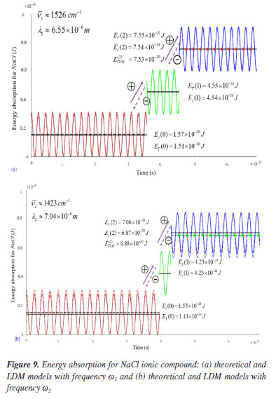 n = 1 to level n = 2, where T1 = ![]() where t2 = 4.53 × 10-13 s, with the mean value in good agreement with quantum value for level n = 2. More generally, this combination of continuous classic energy and quantized energy jumps, allows a theoretical approximation between the quantum level of absorption energy and classical average energy given by ![]() where is the time interval necessary for the molecule start to vibrate with energy at quantum level n. Since the average energy is estimated over each time interval of constant period Ti, using Equation 44 for n = 2, we have ![]() where i = 1, 2 refers, respectively, to ω1 and ω2 circular frequencies of NaCl ionic compound, is the period of each ω1 circular frequency and k = 1, 2,... We can use Equation 46 to obtain an estimate of the energy absorption for the NaCl molecule vibrating with frequency ω1 at the energy level n = 2 using Equation 47: ![]() This result shows a good agreement between the quantized energy for the NaCl molecule at the single level n = 2 and the methodoloy applied here that combines classical equations of continous energy and quantized energy. Previously, Figures 9a and 9b show a picture with quantum theoretical of energy absorption for the NaCl compound only at the level n = 2 represented by a continuous line, the energy absorption estimated by the LDM model represented by a dotted line, and Equation 47 represented by small balls equally spaced in a time interval Δt = T1 = 2.18 × 10-14 s. Our methodology, using the Equations 46 and 47, seems to indicate that it is a best classical approximation of energy absorption in IR radiation for other diatomic molecules or same ionic compounds. In fact, Equations 46 and 47 show an intermediate theory of absorbed radiation for a diatomic polar substance when excited by IR radiation and a classical quantum theory. Unfortunately, this methodology can not to be applied at level n = 1 due to the incomplete cicle of continuous absorption energy by the NaCl ionic compound. In fact, in Figure 9a, Δt12 = t2 - t1 = 0.1 × 10-13 s ≤ T1 = 2.18 × 10-13 s, i.e., the oscillation time of the absorption energy at level n = 1 is much shorter than the period of a complete oscillation of the energy wave. Thererfore, the LDM model, when combined with Equation 47, could not represent the absorption in IR radiation for the NaCl compound at this quantum level n = 1 within this small-time interval. The same occurs in Figure 9b, where, according to the quantum theory the variation, Δt12 = t2 - t1 = 0.01 × 10-13 s ≤ T2 = 2.34 × 10-13 s, is approximately the time for the energy jump from level n = 1 to n = 2. These results obtained with the LDM model seems to indicate that absorption energy of the NaCl compound would be sensible in the spectrum of IR only in the quantum level n = 2. As we said earlier, this methodology can, in principle, be applied to obtain significant data for molecular vibrations with two or more atoms in linear geometry like, for example, HCl and KBr. The LDM model seems to be a reasonable approximation for a realistic representation of the quantum "jumps" of energy as postuled by Max Planck and, when it is combined with Equation 47, a smooth transition from the classical model for energy absorption or emission to quantum jump is revealed. The variations observed in the amplitudes of the NaCl ionic compound with the maximum absorbed energy, seem to agree with Tosato et al.18 that reported: "the NaCl crystal lattice, undergoes small distortion when faced with an electromagnetic field, due to the ions being attracted in opposite directions" (p. 1). Furthermore, each ion in NaCl is strongly bound or attracted to its opposite neighboring ions in the crystal lattice and this may result in a symmetric and stable configuration.12 Everething indicates that despite this, from a theoretical point of view, significant variations occured in the vibrational amplitudes of the sodium and chloride ions of the NaCl ionic compound, but they were not sufficient to cause a important variation in the ionic dipole moment of the compound and, thus, the spectrum of IR absorption is not capable of registering significant energy peaks or, if it does, it is too weak to be considered relevant. This theoretical study on longitudinal vibrations of the NaCl 1D crystal suggests a more accuraty experimental procedure using a greater variation in the magnitude of electric waves to verify or not intensity peaks in the lines