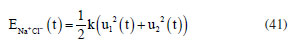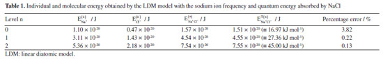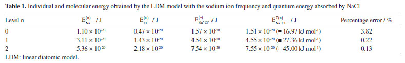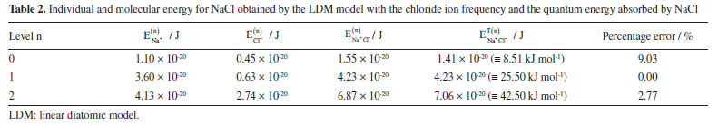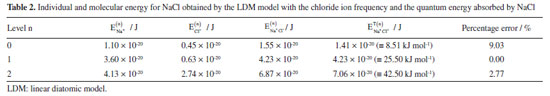 = 4.58 × 1013 Hz, of the sodium ion and with the same frequency of the electromagnetic radiation. The EOSC = hνfNa+ 3.02 × 10-20 J (≡ 18.26 kJ mol-1) is the fundamental energy of the harmonic oscillator. The Bohr frequency condition is valid to E1 - E0 and E2 - E1. Therefore, with base in LDM model that vibrates with sodium frequency shows that it is possible for the Na+Cl- molecule to absorb IR radiation with the wavenumber The equations of energy for the displacement u1 and u2 can be obtained from the classic physics equation given by5 ![]() while vibration energies of each ion of the sodium chloride compound can be estimated using the classical equation for individual energy ![]() where Ei (t) is the vibration energy of each ion, i = 1 representes the sodium ion and, i = 2 the chloride ion. Combining Equations 41 and 42, and using the Bohr frequency condition given by Equation 34, we estimate the energy of each ion and the molecular energy for the NaCl ionic compound. Table 1 shows these data obtained with the LDM model.