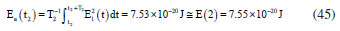 Figures 9a and 9b show the constant energy variations in IR radiation of magnitude EfNa+=hvNa+ for the NaCl ionic vibration in frequency = 4.57 × 1013 Hz and EfC1- = hvC1- for the NaCl ionc vibration in frequency = 4.26 × 1013 Hz corresponding at quantum levels n = 1, 2. The wavenumbers of radiation are, respectively, ![]() where the subscript i designates, respectively, the NaCl compound energy with frequencies of the sodium, if i = 1 and chloride ion, if i = 2, while the subscript j indicates the quantum level of molecular energy. The t1 and t2 parameters are the times where the energy jumps occur. This methodology can also be applied for other diatomic molecules. Max Planck's quantum theory stablishes that the energy of a body is quantized, that is, it can only have specific values.16 The equation that relates the energy of an object, E, and it is vibrational frequency, n, has already been mentioned previously and is given by E = hn, which is the classical oscillator energy. Figures 9a and 9b also show the theoretical and estimated absorption energy for the NaCl ionic compound in IR radiation represented, respectively, by ET(n) = E(n) and EC(n). The results show that the significant energy absorption must occur predominantly at level 2, especially when the NaCl molecule vibrates at the lower frequency of the chloride ion as can be seem in Figure 9b. The duration time for energy to change from level one to level two can be estimated using the LDM model in t ≅ 10-14 s, that is, it is as if there were no level n = 1 of radiation absorption by the NaCl molecule with these conditions. Figures 9a and 9b seen to suggest a good connection between the absorbed energy estimated by the LDM model and the quantized energy. In fact, without loss of generality, let us consider the time t2 for the NaCl to vibrate with energy E(2) in ω1 frequency. Using the mean value theorem (MVT)18 in the range [t2, t2 + T1], where