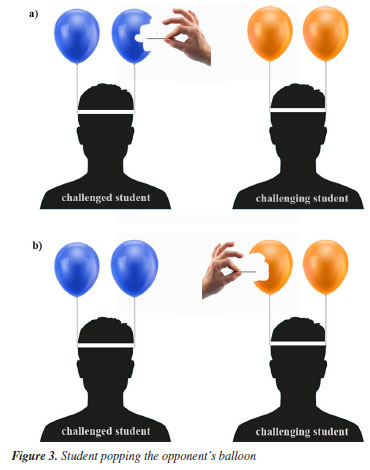 Later, we encouraged the students to study together before the activity day, when they would not have any direct support from the members of their group. Although the activity had an individual character, that is, only one student would win the activity and be rewarded with one extra point in their grade, all students from the winner's group would also be rewarded with a half-point in their grades to foster partnership. Activity day Initially, each group member attached two balloons with their group colors to their head with the help of an elastic band and two plastic rods (Figure 1 and Figure 1S, see Supplementary Material). The time spent for this preliminary preparation was 15 min on average. Next, the Professor projected the Nomenclature Bets 2.0 game10 screen on a whiteboard (Figure 1 and Figure 2S, see Supplementary Material). It is essential to highlight that the students did not sit near each other members of their groups because no exchange of answers was permitted among them during the activity. The steps of Popping Balloons are listed below: