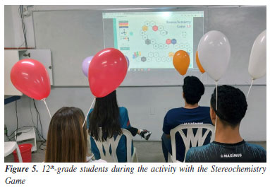 It is worth noting that during the activity, whether using the cards from the Nomenclature Bets game or the Stereochemistry game, the professor played an active role by discussing correct and incorrect answers to clarify doubts and enhance students' understanding of the topics covered. Thus, even though this was not the primary focus of the experiment, the activity indirectly contributed to reinforcing learning and addressing potential conceptual errors during the interaction. Activity day Initially, each group member attached two balloons with their group colors to their head with the help of an elastic band and two plastic rods (Figure 5). The time spent for this preliminary preparation was 10 min on average. Next, the Professor projected the Stereochemistry Game12 screen on a whiteboard (Figure 5). The activity time was 38 min on average and proved enjoyable for undergraduate and high school students, eliciting enthusiastic participation from all. We evaluated the learners' perceptions, and the findings are presented below.