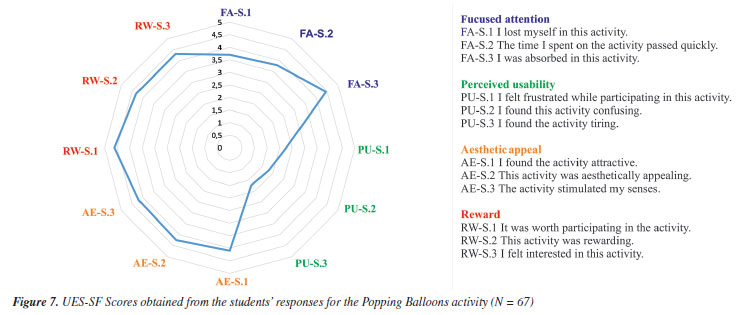 User engagement Measuring user engagement has become essential in different activities, particularly educational ones.36 To assess the level of student involvement in the Popping Balloons activity, we employed the UES-SF.35 It is a tool composed of 12 questions (S7-S18, see Supplementary Material) divided into four domains: