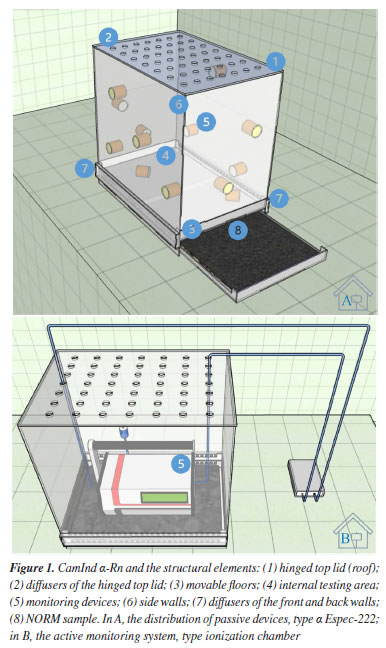 CONCLUSIONS The construction of the CamInd α-Rn allowed the creation of a controlled environment for conducting tests with Rn indoors. The simulator with NORM enabled the study of the concentration and analysis of the behavior of 222Rn in a controlled indoor environment and the combination of passive and active methodologies to assess risks efficiently and cheaply. The placement of passive devices in the simulator contributed to assess indoor concentration related to air diffusion inside the CamInd α-Rn. The physical simulator proved to be efficient in representing a human cohabitation environment, promoting knowledge and experimental planning for evaluating areas impacted by NORM. The experimental arrangements in the simulator corroborate with field studies and can be used for experiment management and standardization of measurement conditions. The product constructed in this research will serve for future applications in the metrology of Rn and in vivo applications using bioindicators, dosimetric studies, certification of passive and active devices, and applications in radiological protection.